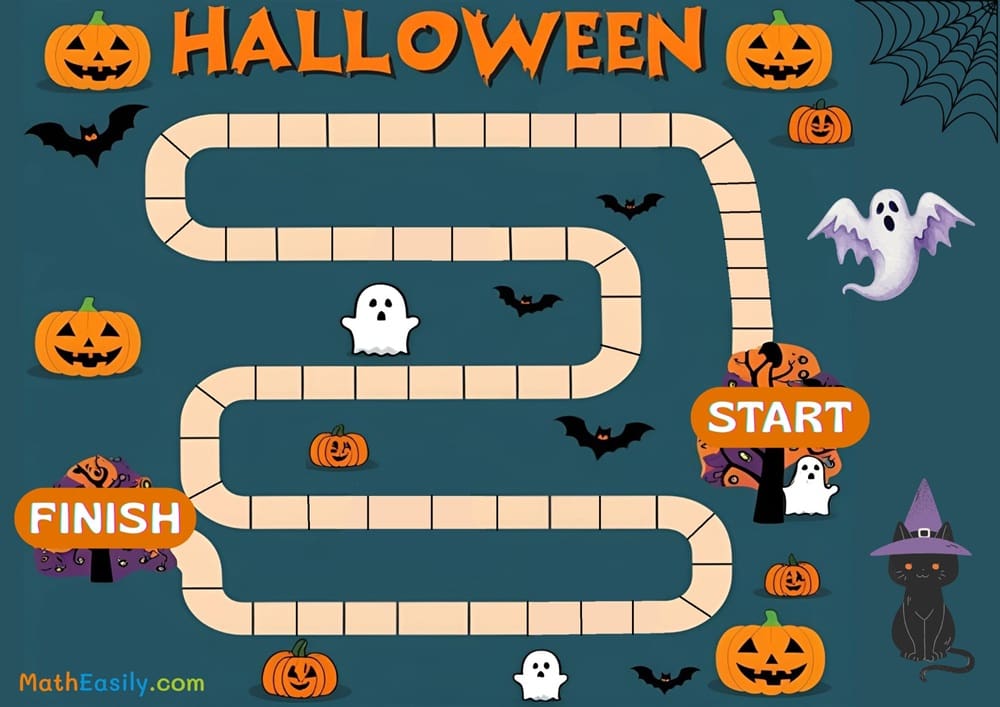 On MathEasily.com, you’ll find two printable Halloween board games with empty fields ready to download and use. Simply print them, grab a dice, and let the Halloween adventure begin!