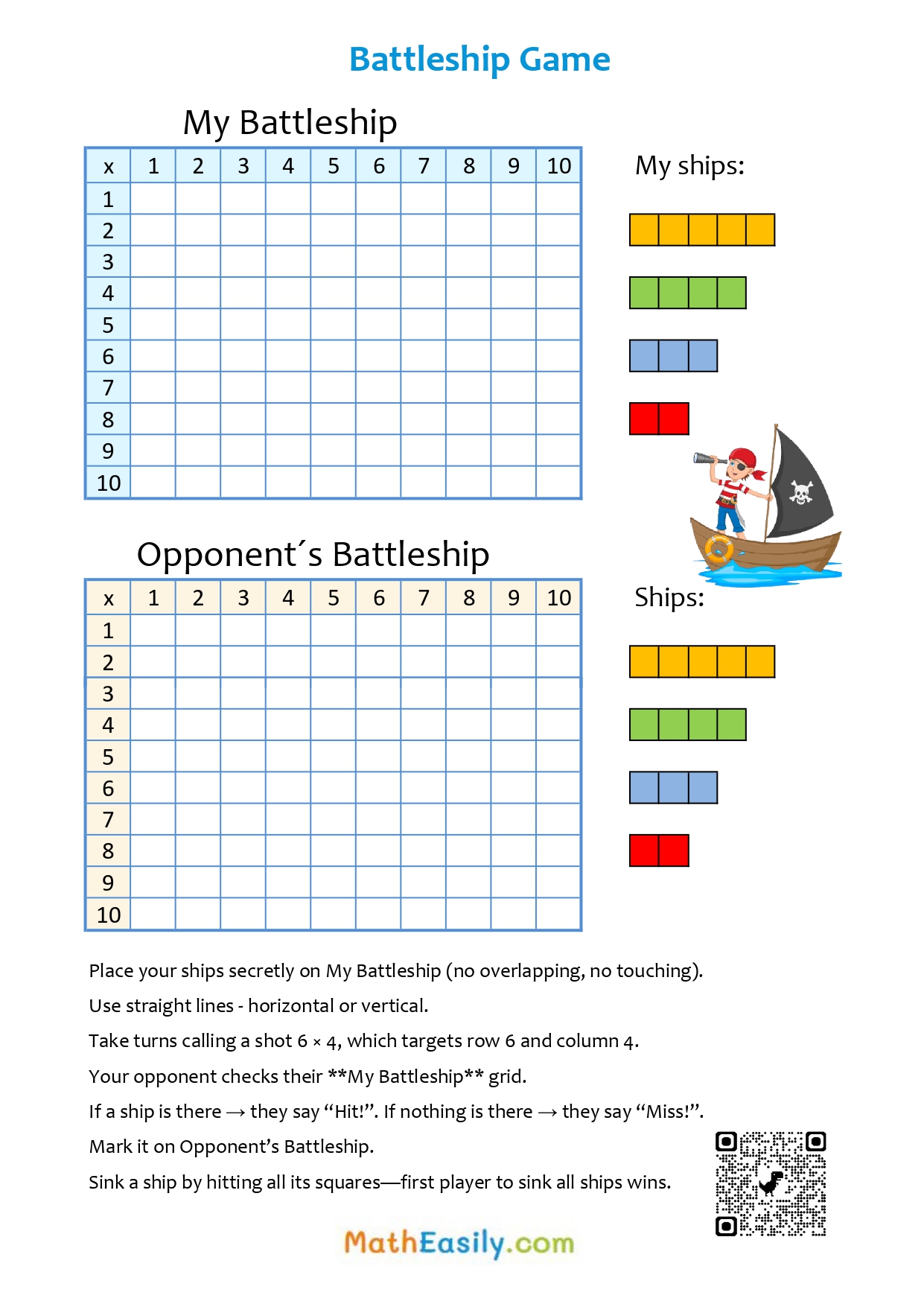 The battleship is fun printable math game for kids and adults that turns math practice into play: choose a square, solve a quick problem, and boom—their shot fires. Math Battleship games are the classic “sink the ships” board games, but with a smart twist: every shot requires a correct answer.